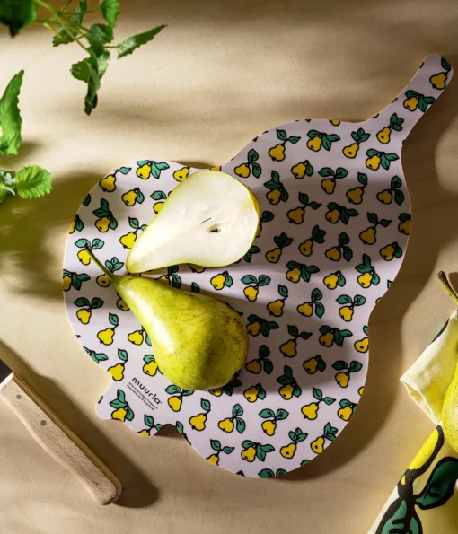 Suloisessa päärynän muotoisessa leikkuu-/tarjoilulaudassa on kaksipuolinen kuvitus. Muurlan Chop & Serve -laudat valmistetaan Suomessa pinnoitetusta koivuviilusta. Koko 21 x 30 cm.